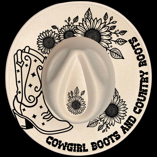 Country Roots And Cowgirl Boots Wide Brim Hat Burning Design SVG PNG